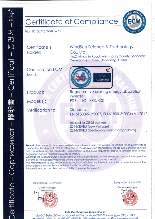 2015年7月产品获得欧盟安全准入认证(CE )证书。