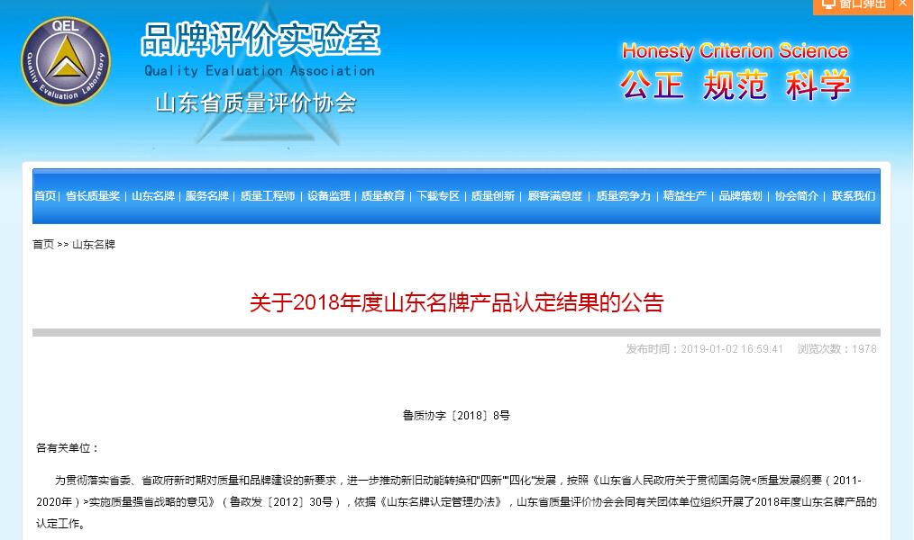 经企业自愿申报、各市推荐、资格审查、材料(网络)认定、现场核查、企业质量信用评价等认定环节的层层筛选及征求意见和社会公示等工作程序,确定了2018年度“山东名牌产品”名单。